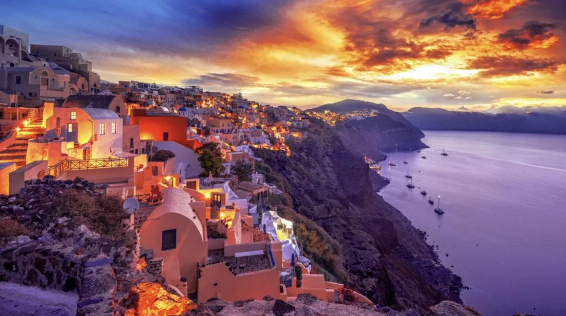 In the heart of the Aegean Sea, there's an island where the sunsets bleed into the horizon, painting the sky with hues of orange and pink. This is Santorini, a place where beauty and mystery meet, a place that might be the lost city of Atlantis. Welcome to the first stop of our journey: the capital of Santorini, Fira. Perched high on the edge of a cliff, Fira offers a breathtaking view of the submerged caldera. The town itself is a maze of narrow, winding streets filled with shops and cafes, each with its unique charm. Fira, with its white-washed houses and blue-domed churches, is a postcard-perfect representation of Greek island life.